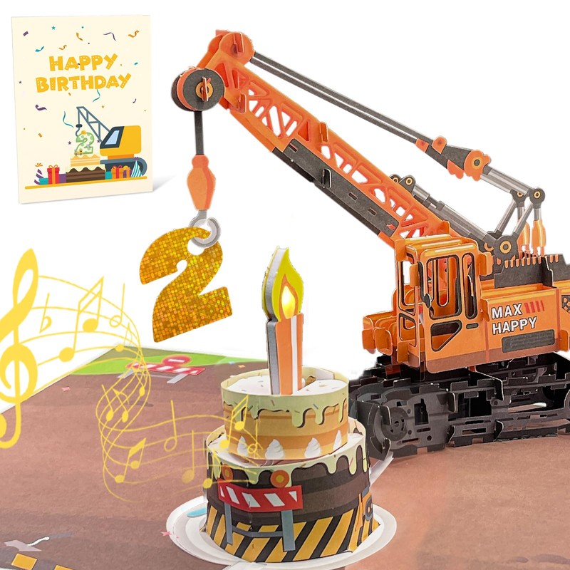 HZYKDWD 2nd Birthday Card with Light & Music, Crane Truck Card for Boy, Nephew, Grandson, Son, Toddler, with Envelope, Greeting Card - When Open, She Plays the Hit Happy Birthday