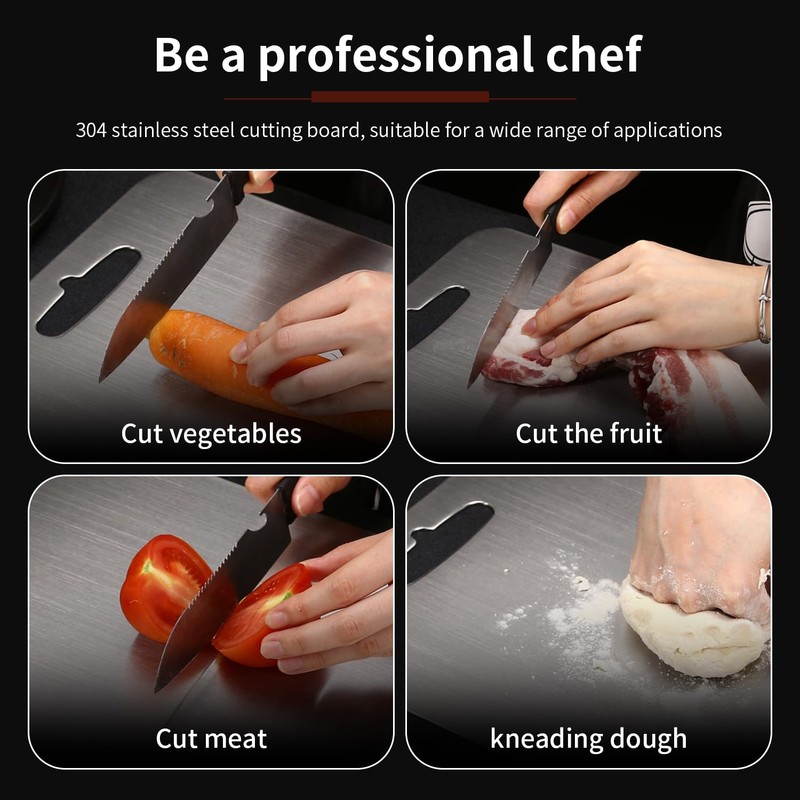 - Quality material: stainless steel chopping board, made of 304 food-safe stainless steel, safe and hygienic, not easy to age, rust or fall debris to ensure a long service life.