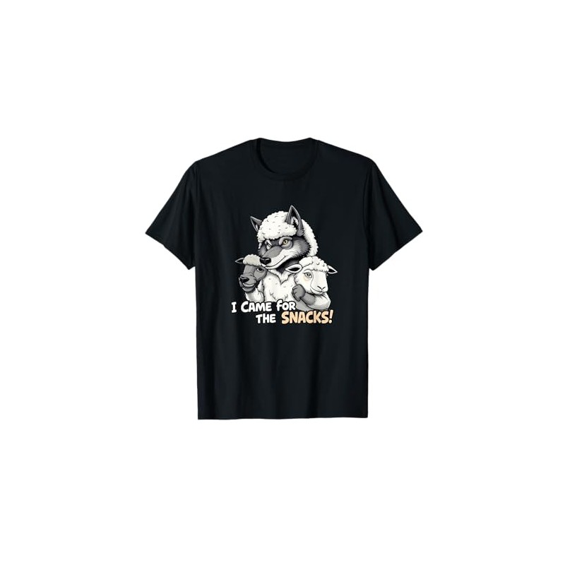 - Funny wolf in sheep’s clothing design Features a clever cartoon wolf wearing a fluffy sheep costume, holding sheep masks in both hands, and the hilarious quote “I Came for the Snacks,” perfect for lovers of witty humor and visual puns.