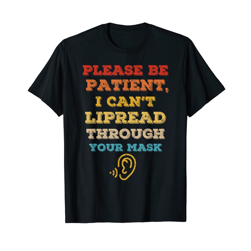 - Please be patient, I can’t lipread through your face mask is a perfect tee for hearing impaired people. The design has a vintage retro color with distressed text with ear symbol for people who has hard of hearing or are deaf. Perfect gift for Christmas.