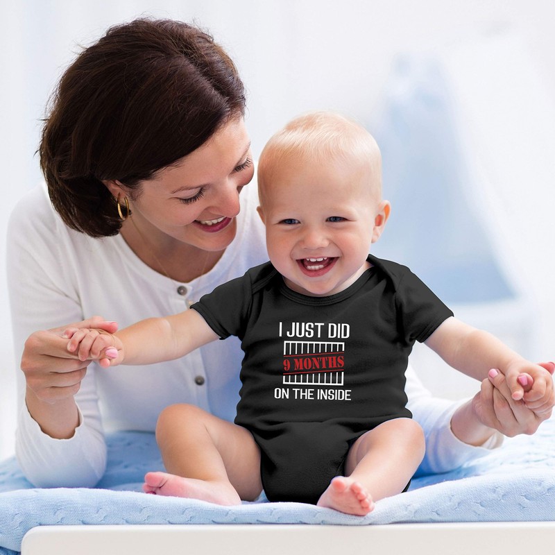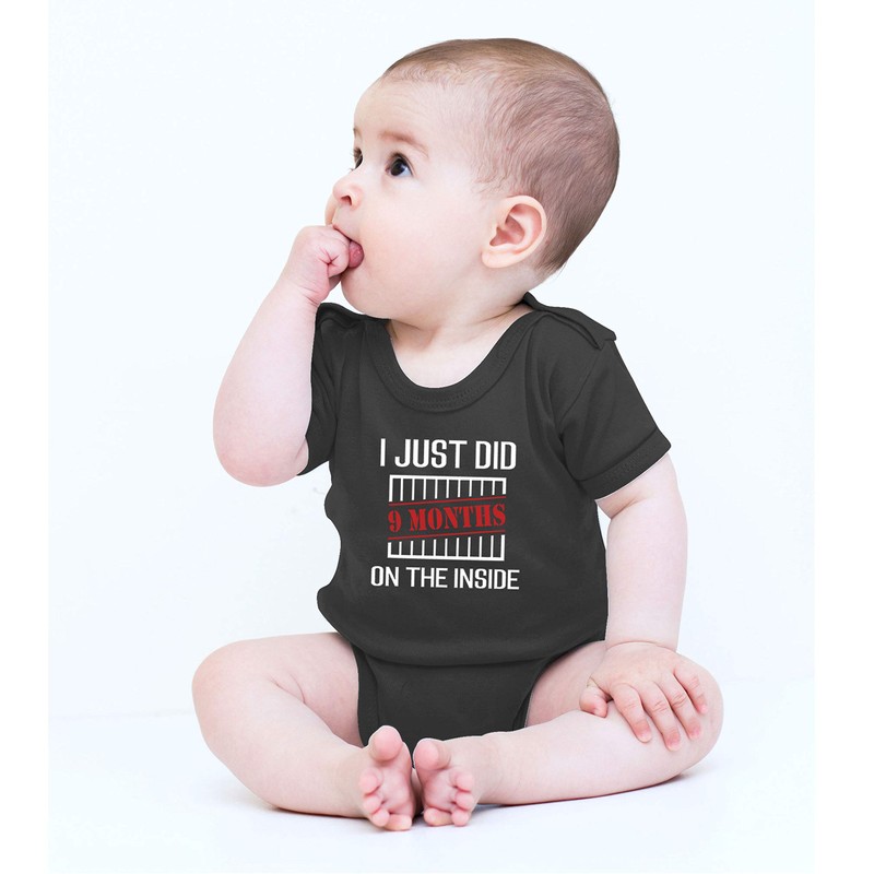 - ★★★★★ A cute addition to your baby's wardrobe! Dress up your little bundle of joy in this super adorable baby bodysuit featuring I Just Did 9 Months on the Inside print at the front. This little romper by Witty Fashions is cute for babies, but even funnier for adults who get the joke. This hilarious design will have all your friends and family laughing at your next special occasion. The babies might have no idea what is printed on their romper, but if they did, rest assured they would love it.