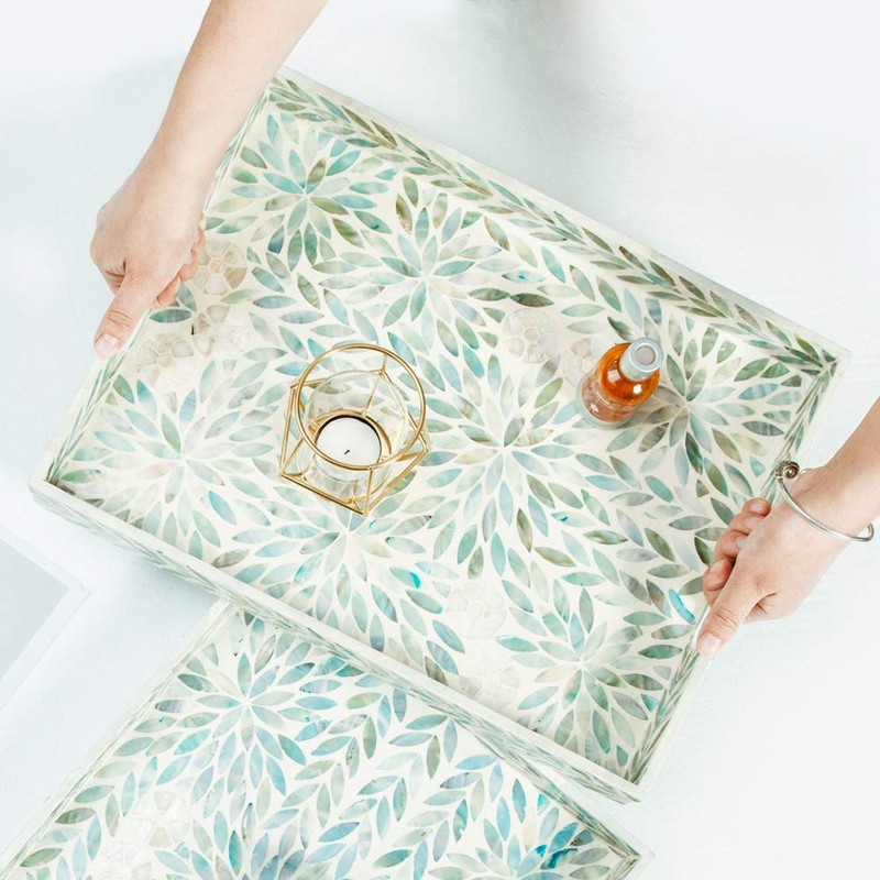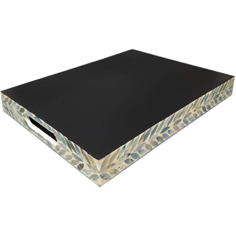 - It is a decorative rectangular serving tray with handles.Mother of pearl shell on surface of tray by hand.Tray dimensions is L35*W25*H4cm / 13.8"(L)*9.8"(W)*1.6"(H)