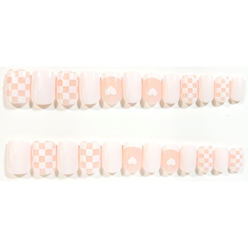 • If you are a fan of the 1980s, then these nails are for you. A pink base nail features a whitewashed version of some of your favorite 80s elements including checkboards and hearts with french manicure tips. Solid whitewashed accent nails complete the look.