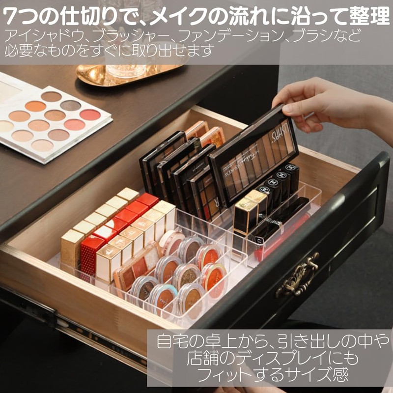 - 【Perfect Cosmetic Organizer Master】This storage case is designed to allow you to select your cosmetics and accessories at a glance. 7 compartments keep your items organized along the flow of makeup Get ready to access your eyeshadow, blusher, foundation, brush and anything you need. The size can be placed in the drawer, effectively supporting the beauty process