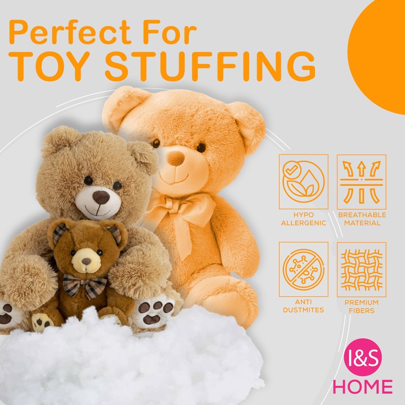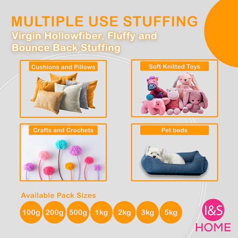 - Unleash Your Creativity with I&S Home Hollow Fibre Toy Stuffing Discover the endless possibilities with our 200g hollow fibre toy stuffing – a must-have for crafters, DIYers, and hobbyists alike. Made from soft hypoallergenic materials, this versatile stuffing is perfect for everything from knitted soft toys and teddy bears to pet beds, cushions, decorative pillow stuffing, and crochet projects. Whether you're crafting cozy home décor, handmade gifts, or fun sewing creations, our premium plush stuffing filling offers the ideal balance of softness and support to bring your ideas to life.