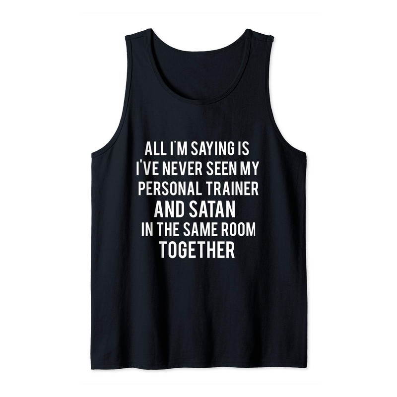 - I've never seen my personal trainer and satan in the same room together sleeveless tee! This funny tank top shirt is great for anyone who knows the pain of a good workout! If you're looking for the perfect workout gym gift look no further!