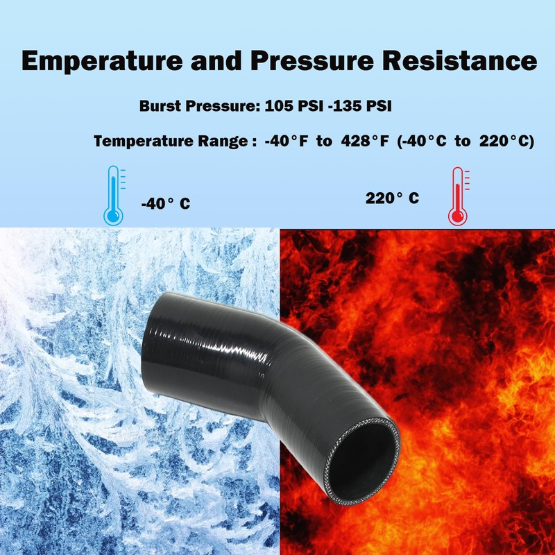 - Emperature and Pressure Resistance45 degree elbow reducer silicone hose is operates effectively within a temperature range of -40F to 428F (-40C to 220C)and supports 130PSI at room temperature for superior safety, making it ideal for extreme weather and industrial applications.