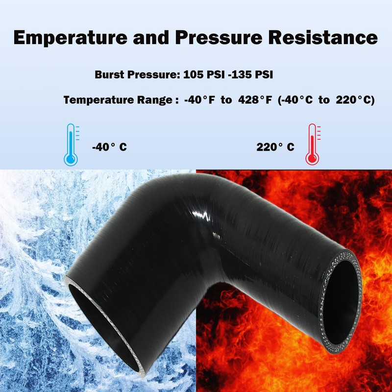 - Emperature and Pressure Resistance90 degree elbow reducer silicone hose is operates effectively within a temperature range of -40F to 428F (-40C to 220C)and supports 130PSI at room temperature for superior safety, making it ideal for extreme weather and industrial applications.