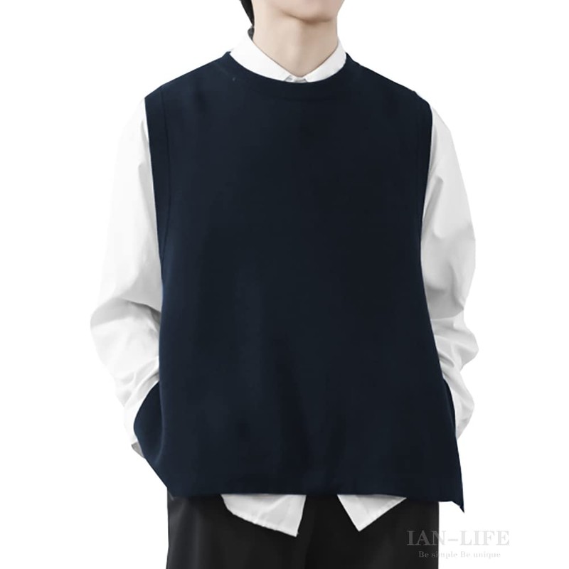 IAN-LIFE Men's Knit Vest, Spring, Summer, Crew Neck, Side Slit, Loose, Casual, Autumn, 3 Colors, M - 3XL, navy