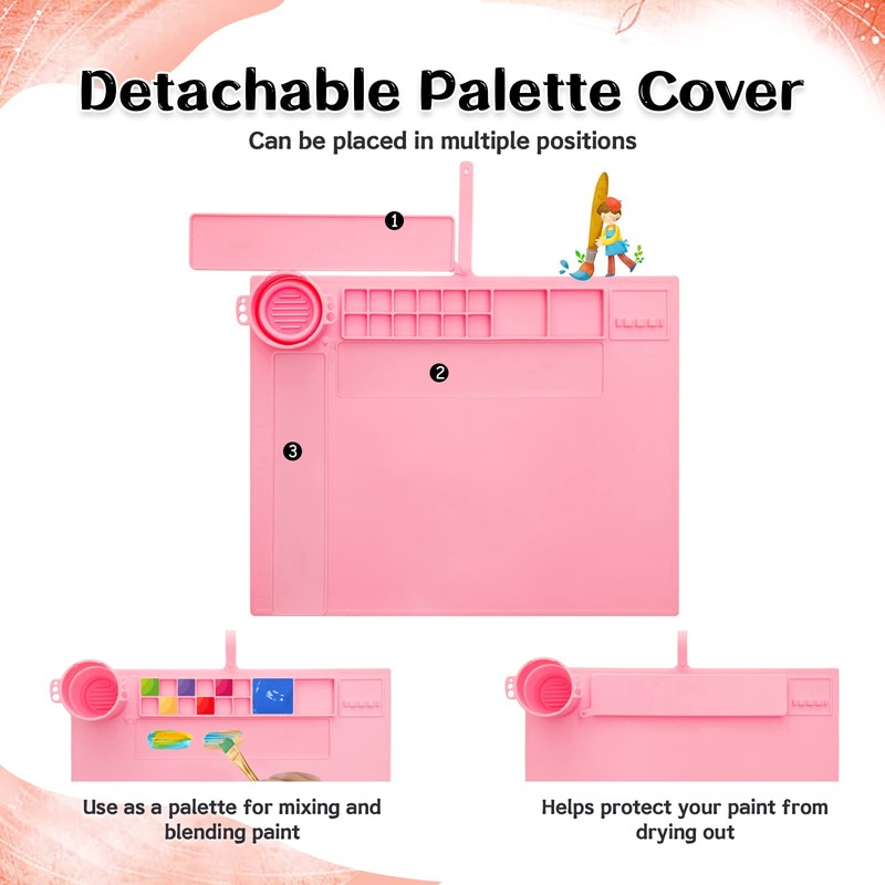 - 【Flexible Design】This Silicone Craft Mat comes with a flexible Lid. It can be used as an extra mixing palette for colors, as well as a lid to prevent paint from drying out. Additionally, it can be easily attached to the mat in various positions.