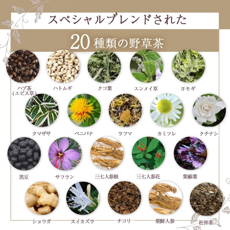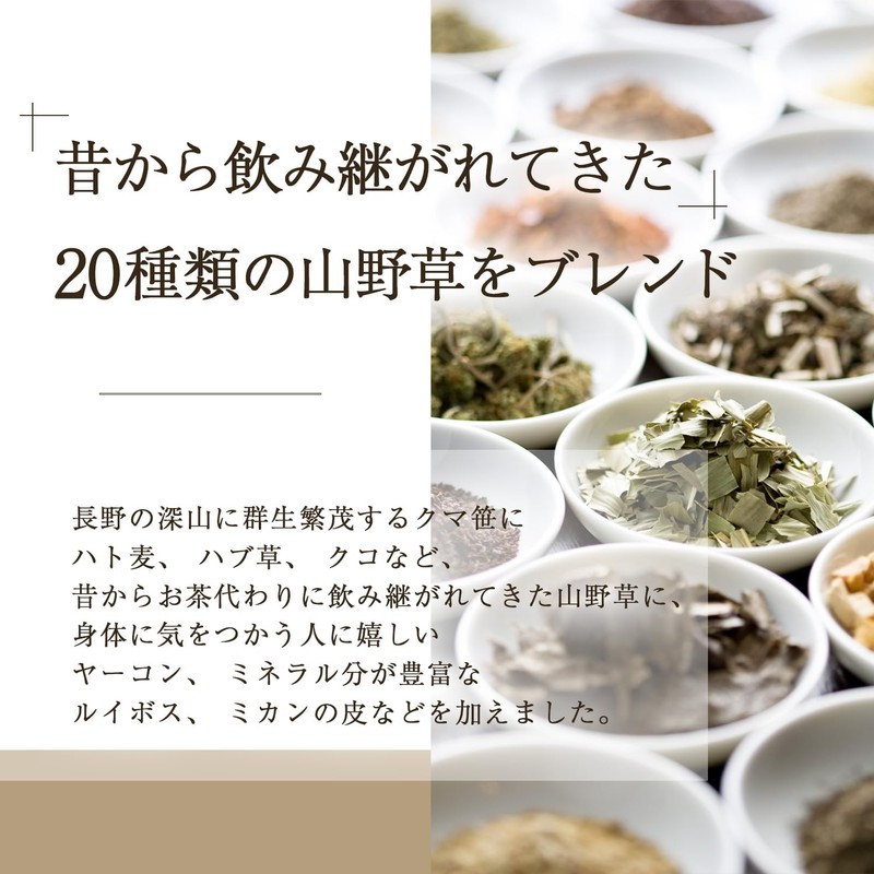 - (Natural Chikara to Clean Heavy Weight) A blend of 14 types of wild plants that have been consumed instead of tea since ancient times, such as bear sassa and diaphragm, growing in the deep mountains of Nagano. The natural chikara helps you keep your daily refreshed