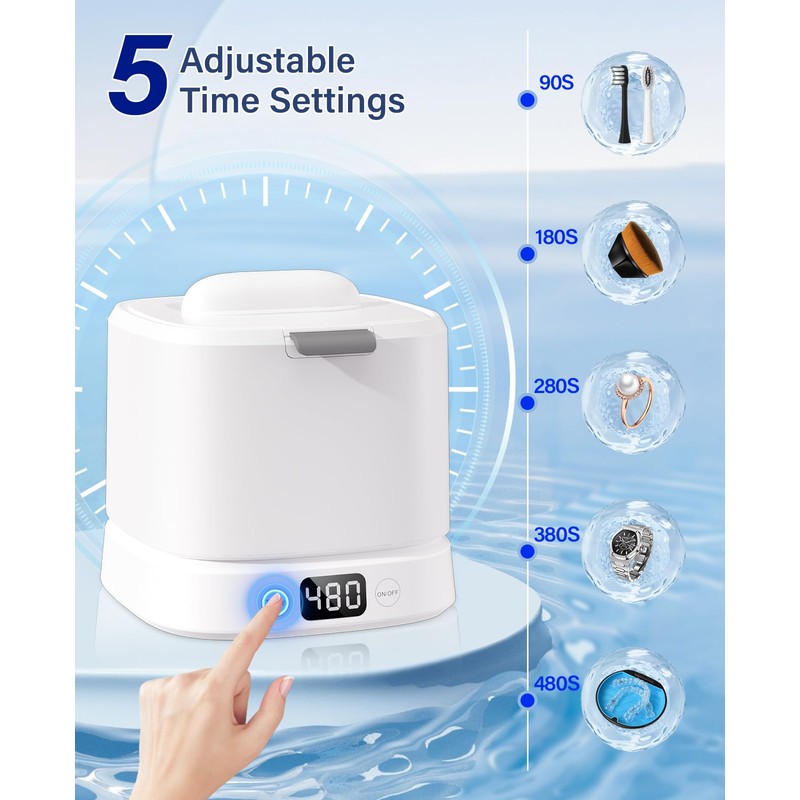 - Easy to use&Five Modes:There are five modes-90s, 180s, 280s, 380s, 480s,this sonic dental cleaner pod suitable for different items from quick cleaning to deep.You just have set the time and click start!For heavily soiled items, it is recommended to use cleaning tablets or agents with the 480s deep cleaning mode. The retainer cleaner also features a digital countdown display, allowing you to see the remaining cleaning time.