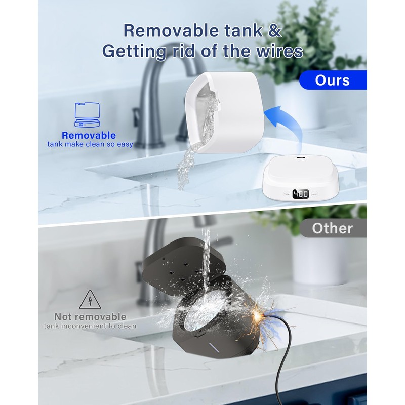 - Superior Design:The removable tank offers convenience. Don't worry about water entering the cleaner when cleaning the retainer cleaner tank. It is a perfect thought for daily use by the elderly with dentures, friends with retainers, wives with beautiful jewelry, and husbands with watches.