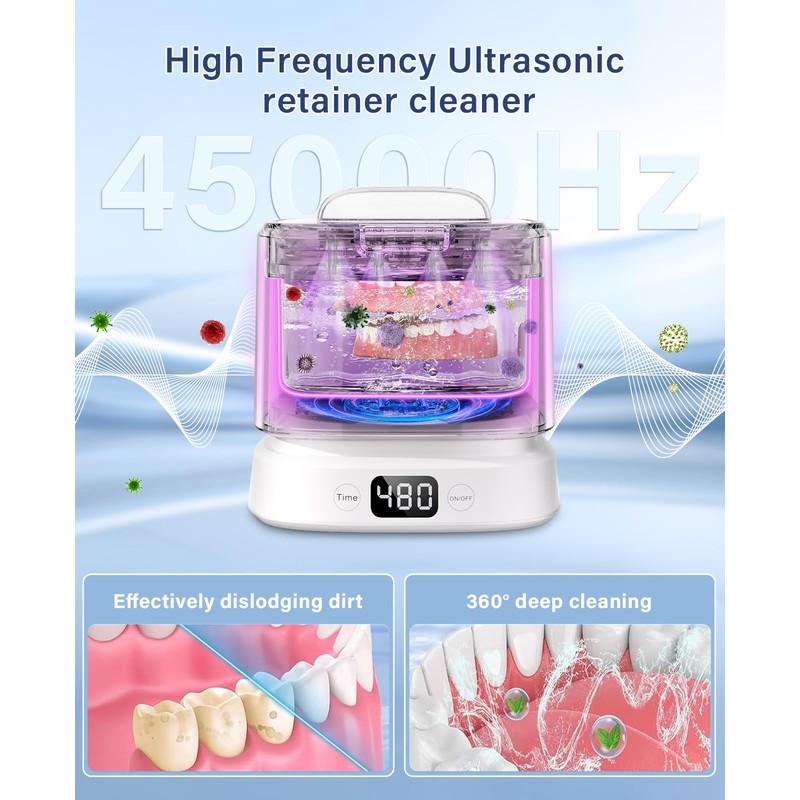 - Deep Cleaning:Our ultrasonic retainer cleaner machine uses a 45kHz vibration frequency to achieve 360°all-round deep cleaning into crevices, effectively cleaning particles from dentures, retainers, braces, night guards or jewelry.
