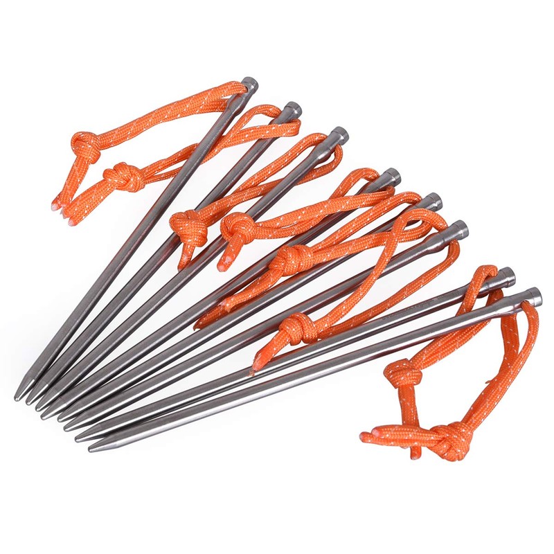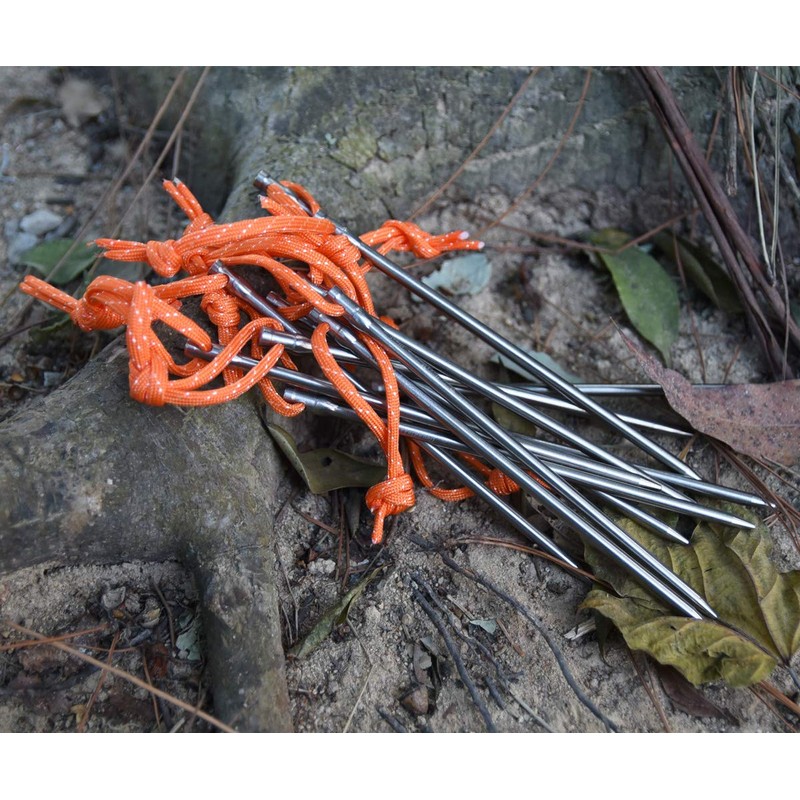 * 5 mm diameter, can increase the strength of the nail itself, in the middle of the hole, put on the rope, convenient take the nail. * Penetrate and hold firmly in a wide range of soil conditions. * The tent stakes provide enough holding power on ground. * Tent stakes included a high visibility reflective pull cord to make the removal process as simple as possible. * Great for backpacking, camping, boating, picnics, work or everyday use.