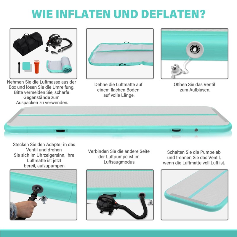 - COMPLETE ACCESSORIES You will receive an Electric air pump when you purchase our Air Mat Only take 8 minutes to inflate or deflate. No noise during training exercise equipment. After inflation, the Air tumbling will maintain its pressure for days. With the carry bag, it will be easy to move around the gym or take to anywhere