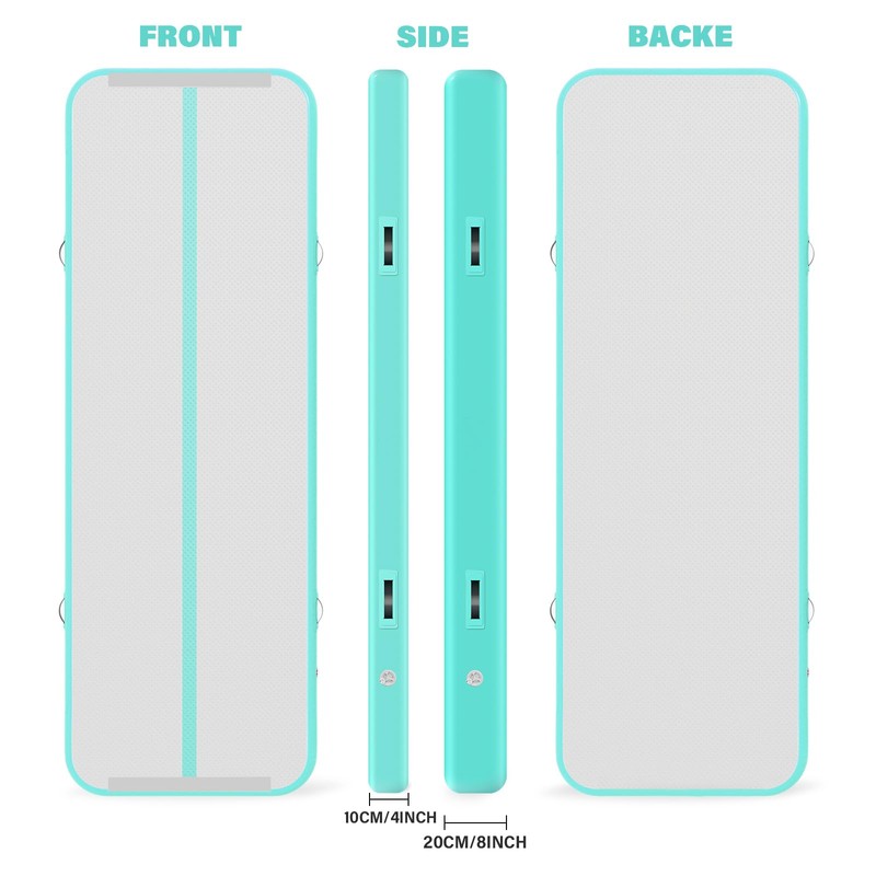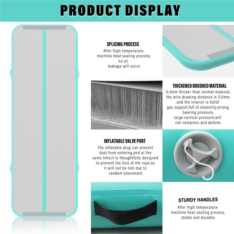 - MORE SAFETYCompared with other exercising equipment, the air pump increases the repetitive frequency and reduces the chance of being hurt. the inflatable gymnastics mat has a high resilience and it can be protect you from hurt when doing exercise