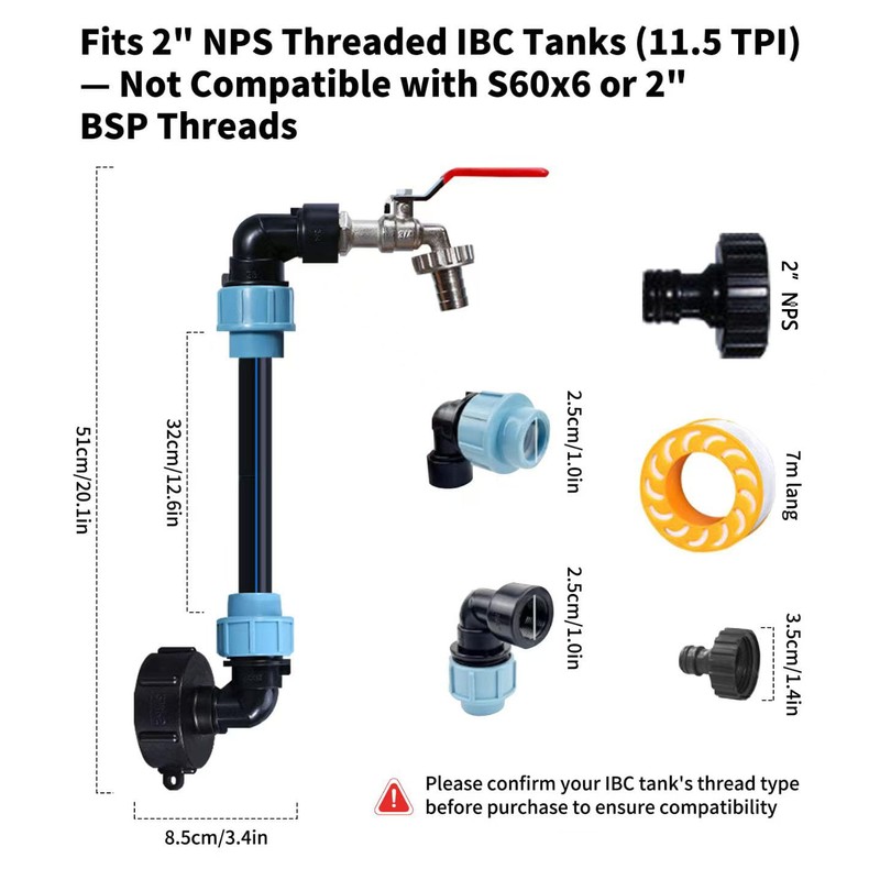 Dieser Adapter passt nicht auf IBC-Container mit S60x6 Gewinde (Standard in Europa) oder 2" BSP. Bitte prüfen Sie die Gewindegröße Ihres Tanks vor dem Kauf, um Fehlkäufe zu vermeiden.