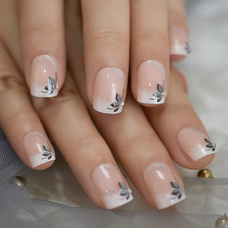iBeautying Press on Nails - Shiny Short Flower Glitter Deco Ombre False Nails | UV Gel Finish Medium Short Coffin Flat Shape Reusable Fake Nails - 24 Nail Kit with Jelly Glue Pad
