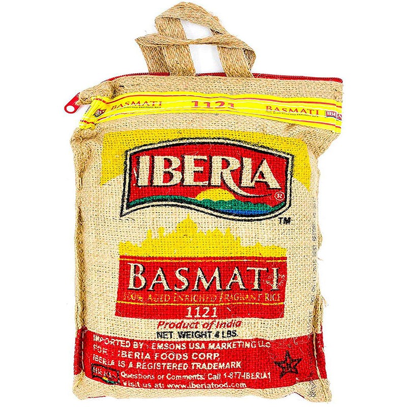 Iberia Basmati Rice, 4 Pound, Extra Long Grain, Naturally Aged Indian White Basmati Rice, Natural Basmati Rice in Burlap Bag with Zipper for Convenience