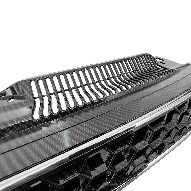 - Package List: 1 x Carbon Fiber Print Front Upper Grille with Chrome Trim..