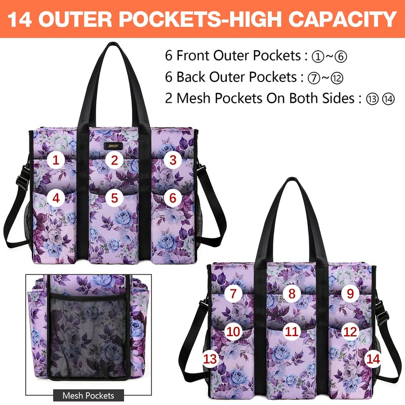- 14/24 Exterior Interior Pockets - Large Size: 14 exterior and 10 interior pockets. Medium Size: 8 exterior and 6 interior pockets. The Large utility bag includes a laptop compartment inner pocket, can hold a laptop up to 16 inch. Especially suitable for people like teachers, is a perfect teacher utility tote.