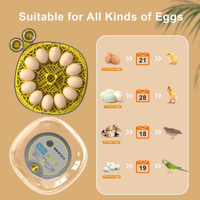 IBKINXX Incubator for Hatching Eggs-12 Egg Capacity, Automatic Egg Turner, Temperature & Humidity Control, 360° Viewing for Chicken, Duck and Quail Eggs