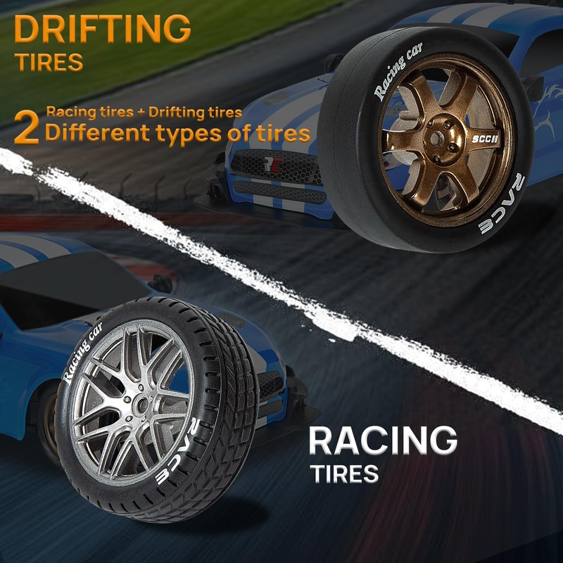 - Interchangeable tyre system for racing and drifting: Easily switch between two riding modes with 4 durable racing tyres and 4 soft drift tyres. With the included screwdriver, you can quickly replace the tyres and thus cope with rough terrain or dominate smooth indoor tracks. (Note: Drift tyres wear out faster on rough surfaces - so use racing tyres!)