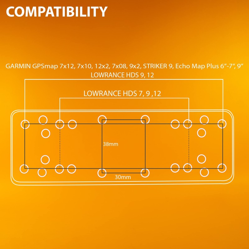 - FEATURES: a 30x38 mm industry standard 4 hole pattern (=AMPS) that will work with all industry standard AMPS adapter plates and hole patterns that are compatible with GARMIN GPSmap 7x12, 7x10, 12x2, 7x08, 9x2, STRIKER 9, Echo Map Plus 6”-7”, 9” and LOWRANCE HDS 9, 12 fish finder/ marine electronic equipment.