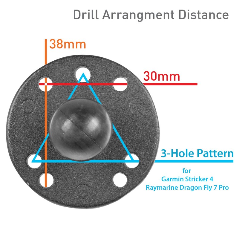 • COMPATIBILITY - Features a 30x38 mm industry standard 4 hole pattern (=AMPS) that will work with all industry standard AMPS adapter plates and the 3 hole pattern that is compatible with the Stricker 4 and Raymarine Dragonfly 7 Pro Fish finder series.