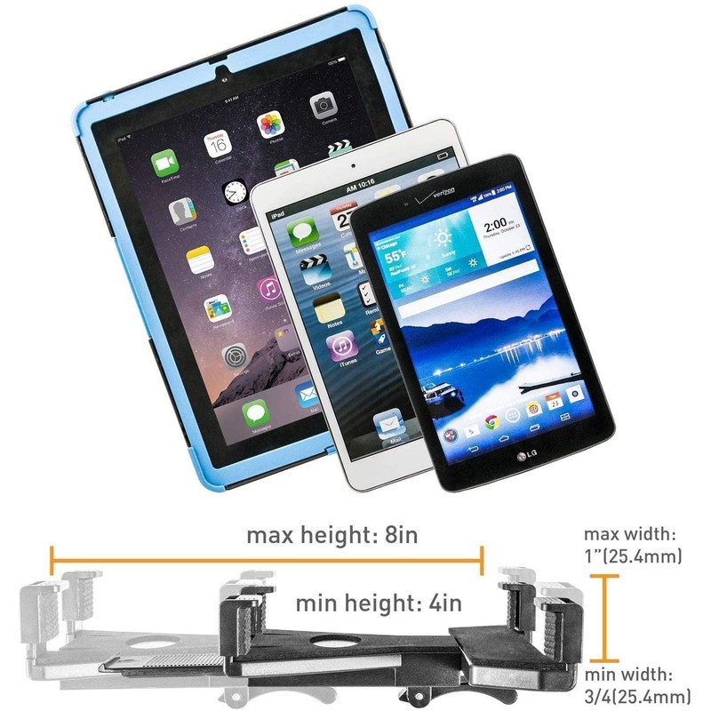 • ADJUSTABLE - Each tablet holder rotates 360 degrees for optimal viewing positions. Insert Tablet into holders horizontally and then rotate to desired viewing position. Clamps your tablet in a secure hold, but is easy to remove as needed. Includes optional drill base for a more permanent solution
