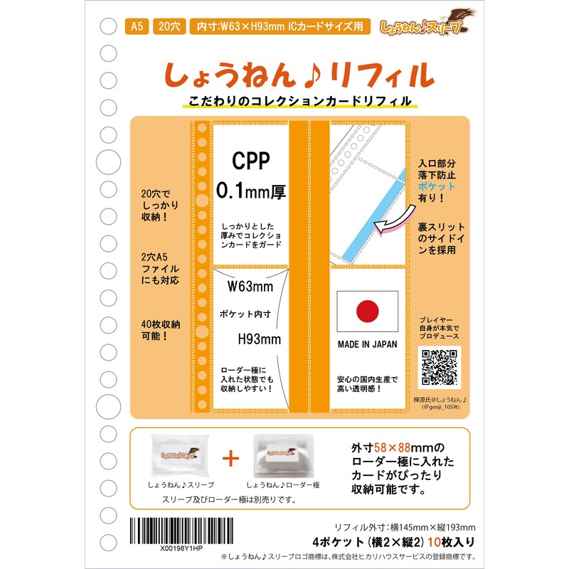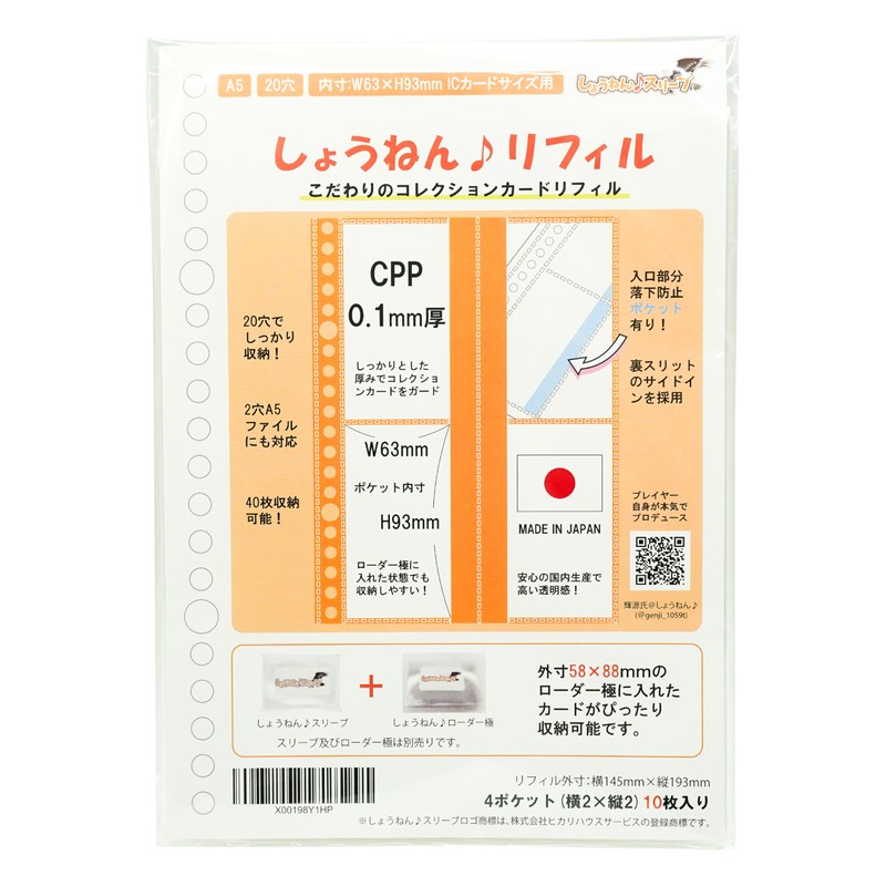 Refills compatible with the popular extra-thick sleeve "Shinoen Sleeve" (IC Card Size Support) has arrived. Shinoen; Filing is possible while the loader pole is attached. Perfect for ornamental and filing of cheki and arcade game cards. Comes with an anti-drop pocket for peace of mind when you are on the go. Mr. Kizizen’s arcade gamer of the game center @genji_1059t, wants a side-in refill with high transparency and anti-drop pockets. This is an A5 20 hole refill made in Japan. The external dimensions of the refill are 5.7 inches (145 mm) wide x 7.6 inches (193 mm), and the A5 size binder is compatible with A5 size binders, and it is also convenient to carry around with you, so it can be used for trade on the go. Shine; Sleeve or pine; You can store important cards while the loader pole is attached. Because the material is Polypropylene (CPP), the ink of card is not transferred to as on-demand printing or other card inks into the refill. CPP (non-stretching polypropylene) has a slightly whiter and turbidity than OPP (2-axis stretched polypropylene) but has excellent heat resistance and tensile strength. Shonen Refills Compatible Cards, Sleeves and Loaders: Supports Arcade Game Cards, Board Game Cards, Driver Licenses, My Number Cards, Memo Cards, and Contact IC Cards. Sleeve is sold separately (Width 2.2 inches (55.5 mm) x Height 3.4 inches (87 mm) CPP0.1 mm thick hard perfect sleeve [IC card size] Shine; Sleeve or [IC oversize for double sleeves] CPP0.1 mm thick hard perfect sleeve [Width 2.2 inches (57.5 mm) x Height 88 mm). Loader is sold separately (IC card sizes) Hard PVC perfect side loader (inner diameter width 2.2 inches (56 mm) x height 3.4 inches (87 mm)). Perfect for the loader pole size. Please note that when the loader pole is attached; The pocket itself is the perfect size for the loader pole, so we recommend storing it without using the lid of the pocket to prevent falling. Shonen Refills are only refills. Purchase your favorite 20-hole A5 size binder files.