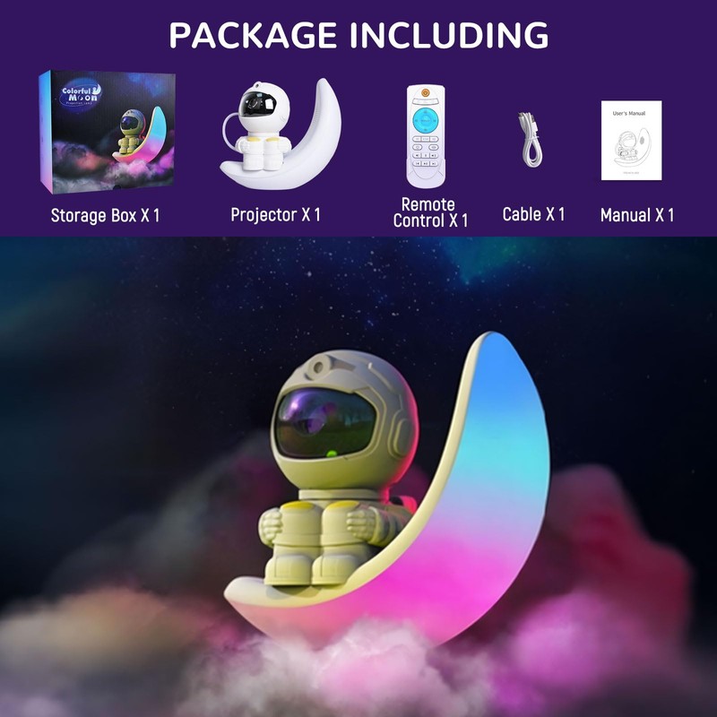 - MOON-SHAPED AMBIENT LIGHT: Astronaut galaxy projector shape is moon design, but also an atmosphere lamp. Multicolor light options allow you to complement room's decor or match current mood, making it ideal for relaxation or as a comforting nightlight, from a romantic evening to a peaceful night's sleep.