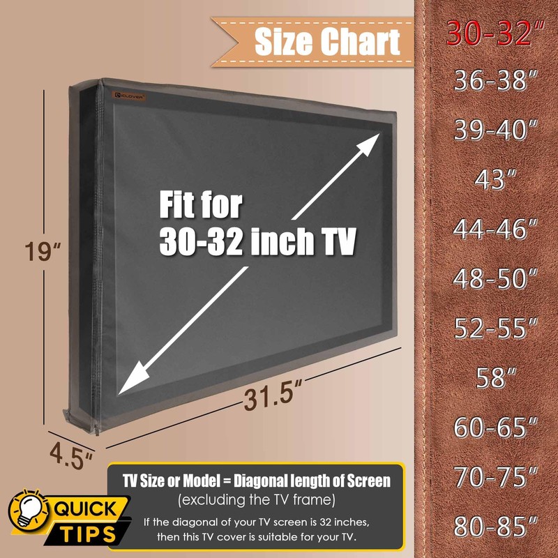 - FOR 32-INCH TV: 31.5"W x 19"H x 4.5"D. Compatible with most 32-inch television models. The size gives allowance to cover tv stand, digibox and sound bar. 【Must measure your TV outer size included the frame to ensure compatibility with the outdoor TV cover.】