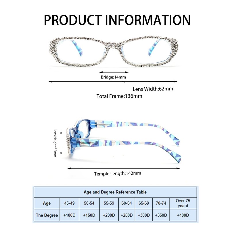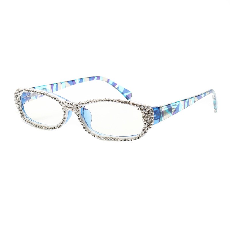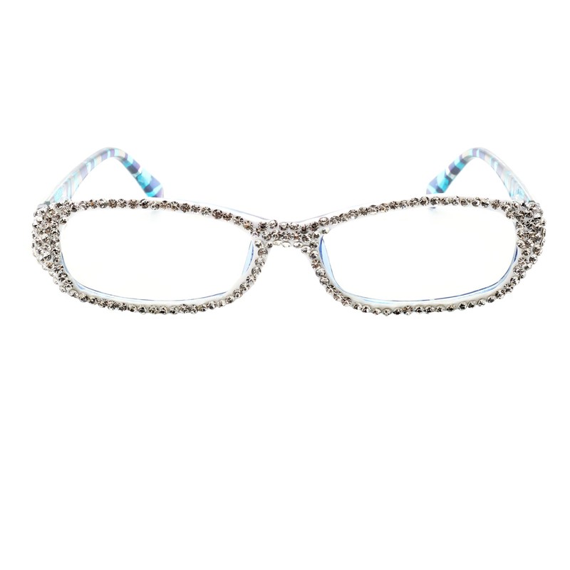 - Classic shape fashion frame reading glasses updated with gorgeous diamonds and a fun colorful design for a fresh look. Universal size fits most face shapes.