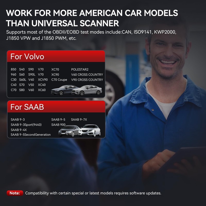 - 2025 VOL V1.0 OBD2 scanner for Volvo/Saab Adds-on more Data Stream and enhances more Data Details catching-ability,help to view the whole car ECUs' live data for advanced system and sub-systems like ABS, SRS, transmission, engine and more. With Special OIL & SAS Reset Functions lets you to do the dealership-level relearn/calibrate procedures. It is the professional leve car diagnostic scanner for those needing a scan tool or mechanic tools to do the car maintenance or repairs