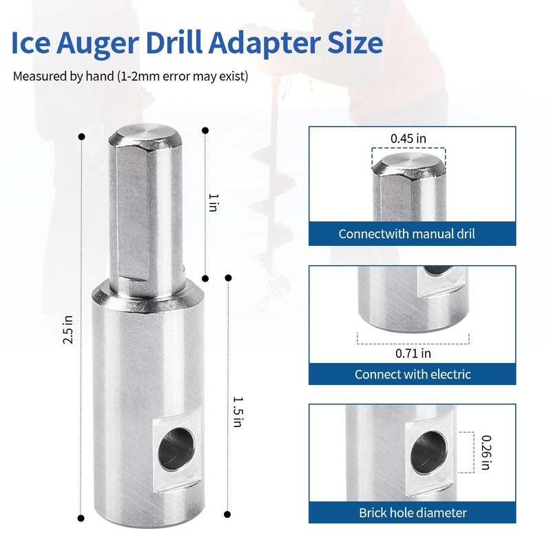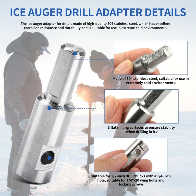• 【Compatibility】The ice auger drill adapter is suitable for 1/2-inch drill chucks with a 1/4-inch hole, suitable for 1/4"-20 wing bolts and locking screws.