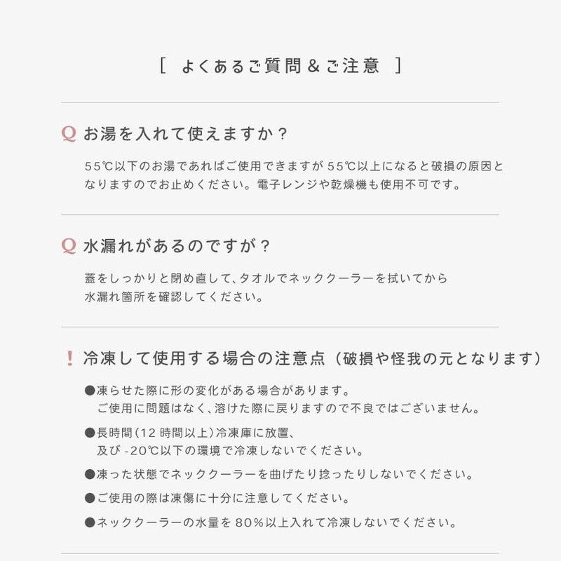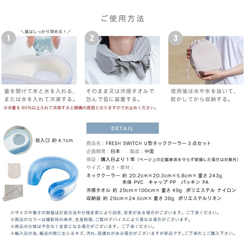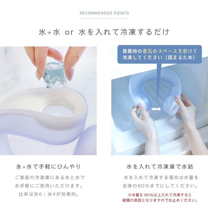 - Fill with ice and water and wrap it around your neck and the ice bag will blow away the heat. In addition, you can place it on the inside of the elbow, and the temple, and the inside of the elbow, cooling the blood circulating from your body and efficiently lower your body temperature. In addition to preventing clothes from getting wet due to condensation by using the included cooling towel, the condensation water causes the towel to cool and reduce body temperature. It is also useful when you want to keep it in place, such as preventing frostbites, etc. Enjoy a comfortable summer with the FRESH SWITCH U shaped ice bag with a cooling towel