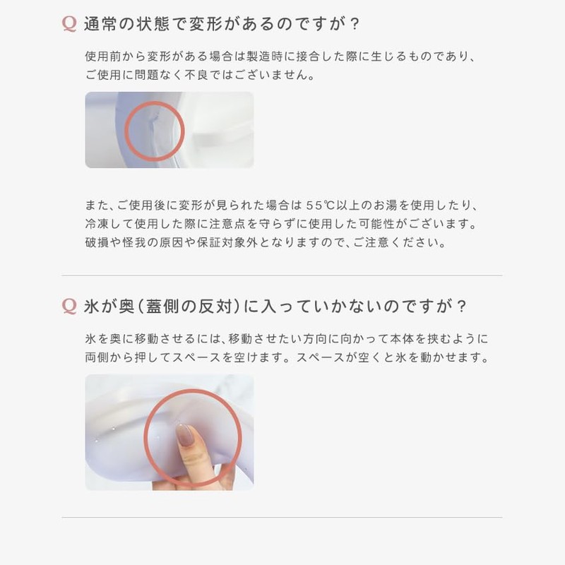 - [How to use] Fill with ice and water from the opening port of 1.6 inches (4 cm) in diameter. The 6:4 ice to water ratio is effective. You can also easily adjust the position when you place the ice first. When filling with water and freezing, please fill it up to 80% of the whole product. If you fill it with more water, it will increase the volume when the water freezes and cause damage. When freezing, please leave room at the neck to freeze (to keep it in the closed position). After use, please drain the water and dry it. Convenient to use the included storage bag when carrying