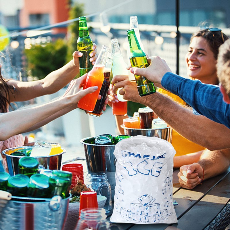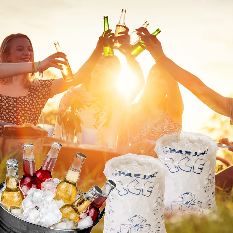 - 4. Multi-Use: These multi-use plastic ice bags can be used twice without weakening or ripping too! Use them with your favorite wines and beers at picnics, barbecues, parties, sporting events and more. Keep your coolers filled with crunchy ice thanks to these double-stitched drawstring ice bags.