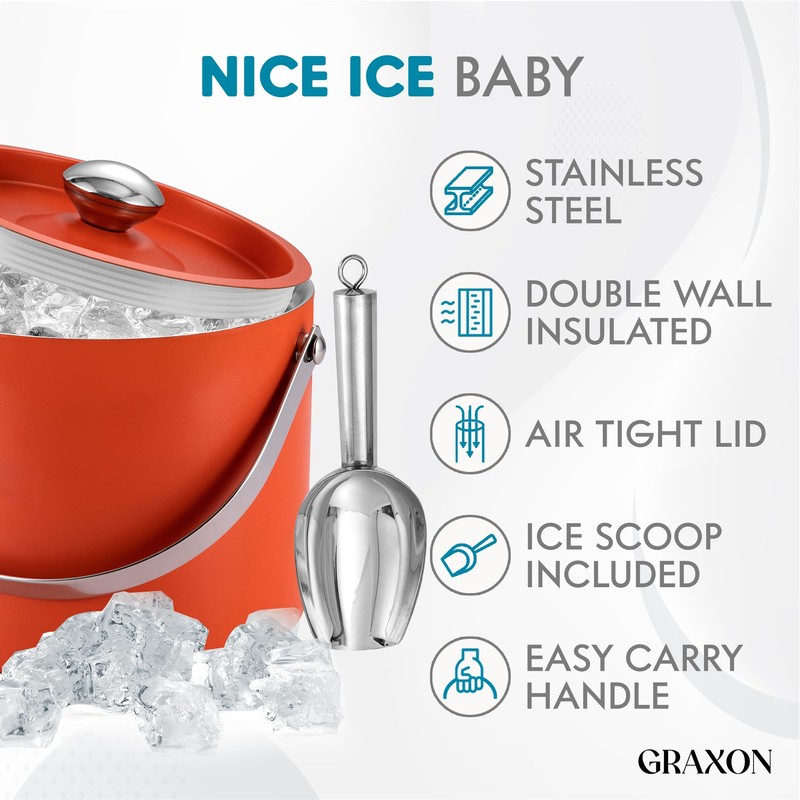 Ice Bucket (3 Liter) Stainless Steel Double Wall Insulated Ice Bucket with Lid & Scoop, Ice Buckets for Parties, Handle, Keeps Ice Cold for Hours, Great for Wine, Champagne, Cocktails (Orange)
