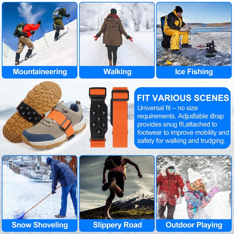 - ONE SIZE FITS ALL: Our ice snow grips are universal, designed with an adjustable elastic strap, easily stretch and wear over your shoes or boots. Provides a secure fit for all types of footwear. Suitable for men and women.