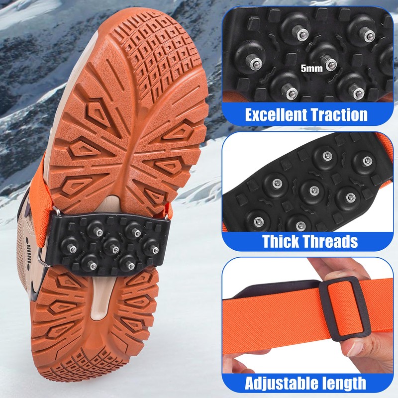 - 【7 STUDS DESIGN】Seven Studs deisgn,the crampons has a great traction,which can reduce slipping and falling on ice or snow and give users secure foot traction.