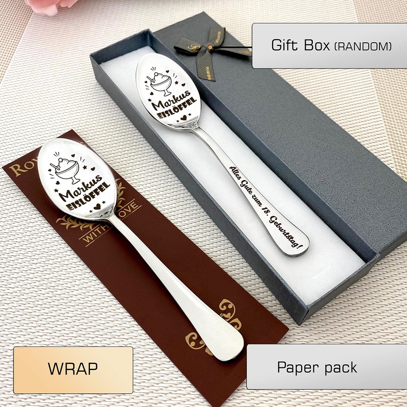 The ice cream spoon comes in paper packaging or in a beautiful gift box. So you have a gift that you don't have to worry about! For name engraving, unique design, custom image on spoon. Ice cream spoon is a great gift for Christmas, Valentine's Day or birthday, keepsake for an ice cream lover/killer and dessert eater.
