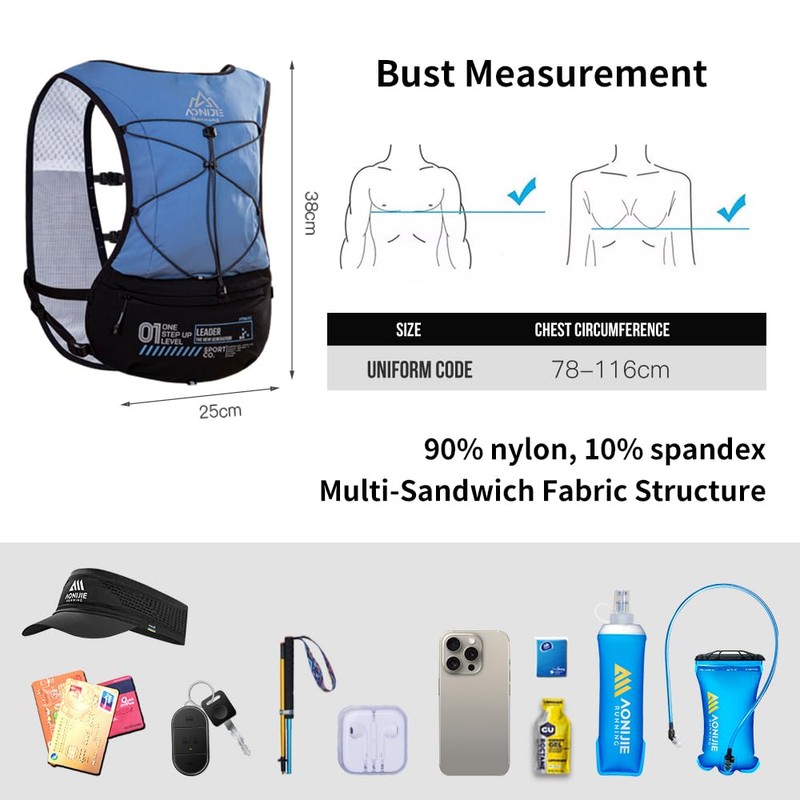 • 🏃‍♂️【Lightweight & Comfortable】This 5L running backpack is made of 90% nylon fabric and 10% spandex, weighs just 280g / 9.8 oz, chest circumference: 78-116cm / 30.71-45.67''. that's very comfortable and durable.reducing much of the load during the running.