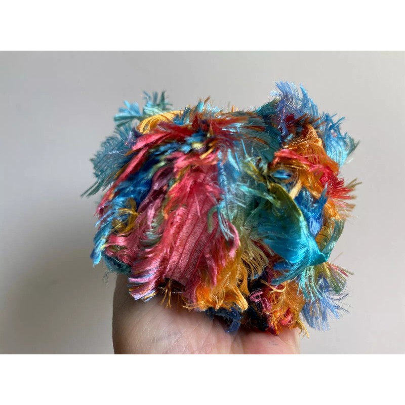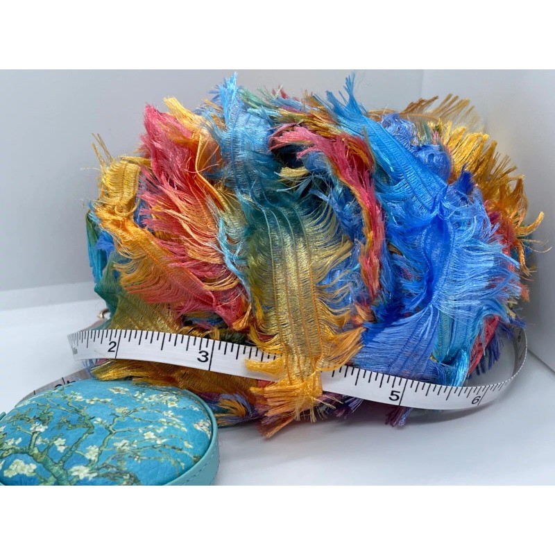 This is a wide ribbon style yarn with feather eyelash / boa edges - width approximately 1 and 1/4 inches - a light and soft nylon fringe - gorgeous variegated color blends - a similar yarn to Plymouth Parrot, but lighter weight inch per inch results in more yardage per skein.