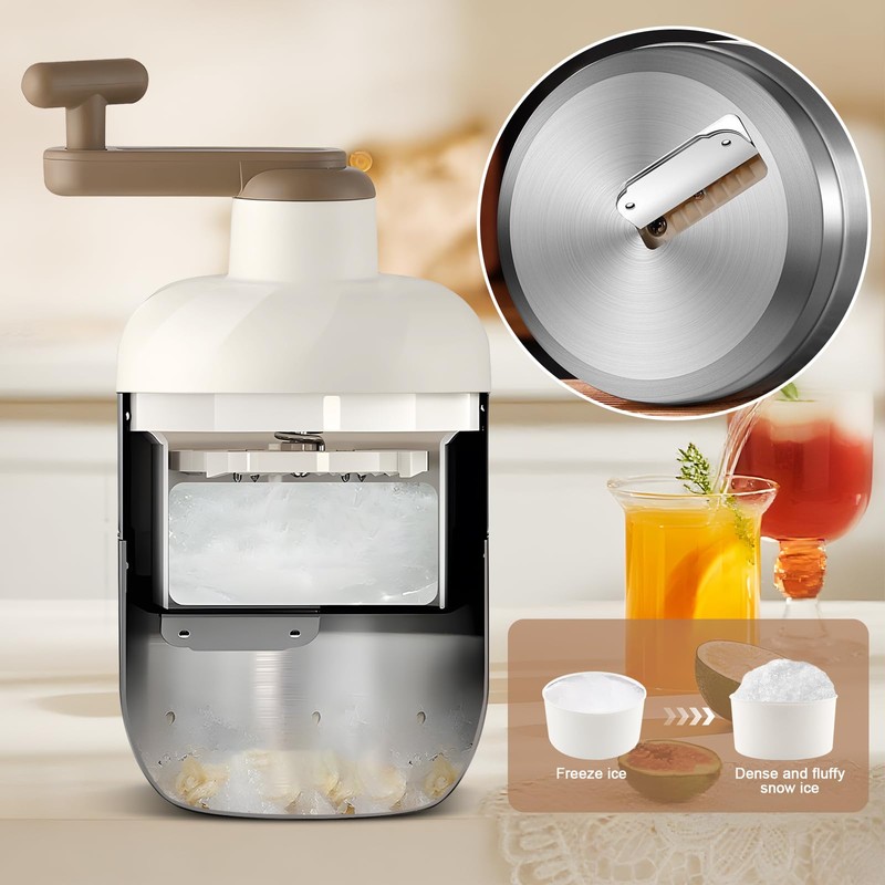 - Easy to use, clean, carry, and store. The portable hand-crank design makes it easy to make shaved ice and ice cream, even outdoors without electricity, and for creating specialty drinks.