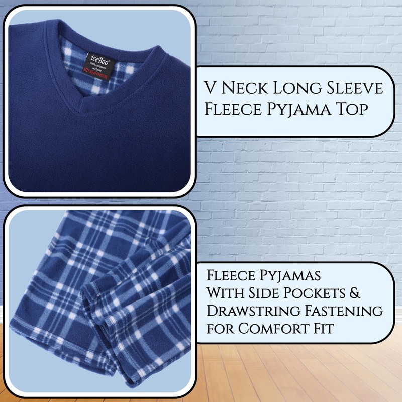 iceBoo Mens Fleece Pyjamas Set - V Neck Top & Plaid Bottoms with Side Pockets and Drawstring Fastening Waist - Comfortable Pyjamas for Men - Mens Pyjamas Set - FM78 - L