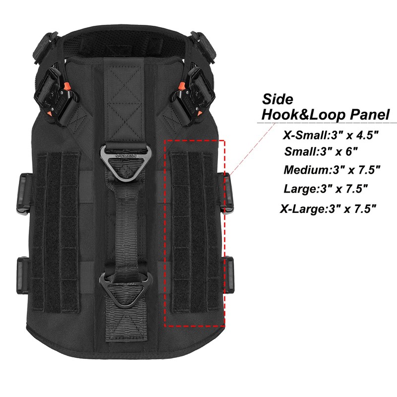 - [DOG IDENTIFIED]:Hook and Loop Panel Sewn onto Both side of harness(X-small:3"x 4.5";Small:3"x 6";Medium/Large/X-large:3"x7.5") ;One Square Loop Panel( X-Small/Small:2"x2";Medium/Large/X-large: 2"x4" )Sewn on The Front Chest ,You Can Attach Many dog Patch to Identify Your Dog