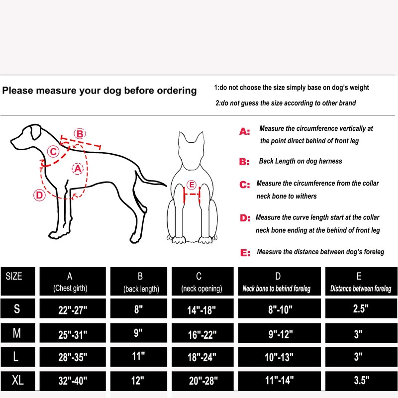 Tips:1:This is not to be used with a tie out; 2:Please refer to our size chart,Make sure match up your dog's lower neck ( C: right above their shoulders) and chest measurements( A:the widest part of the chest);